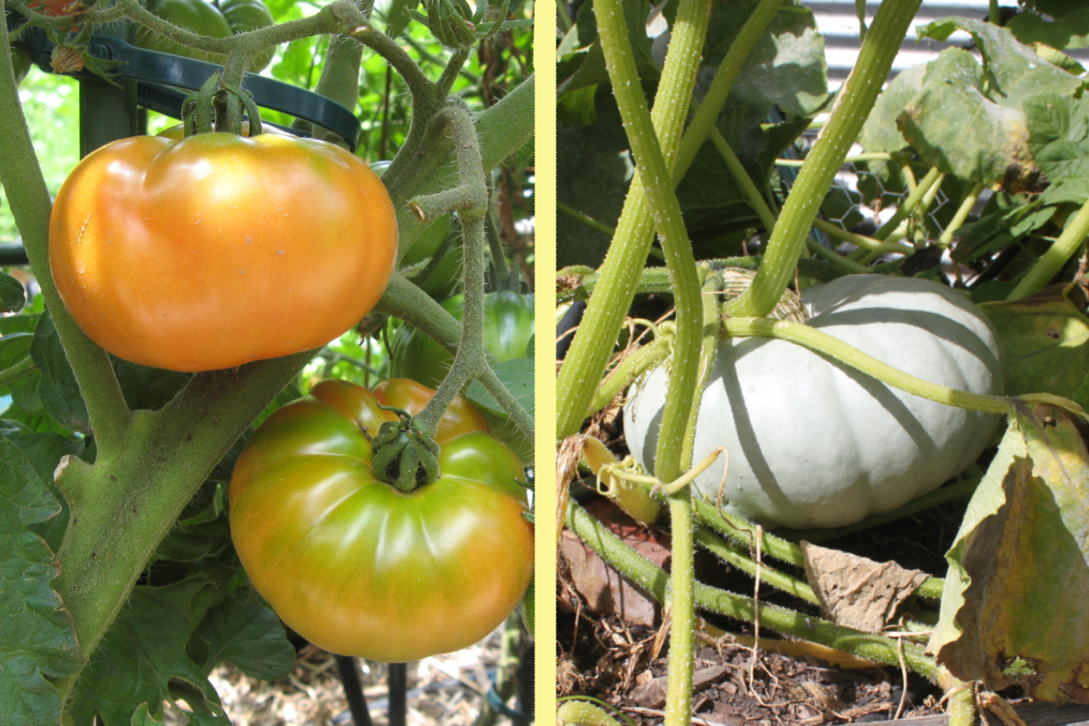 Two examples of annual vegetables. LEFT: Rouge de Marmande tomato. RIGHT: Grey Crown pumpkin.