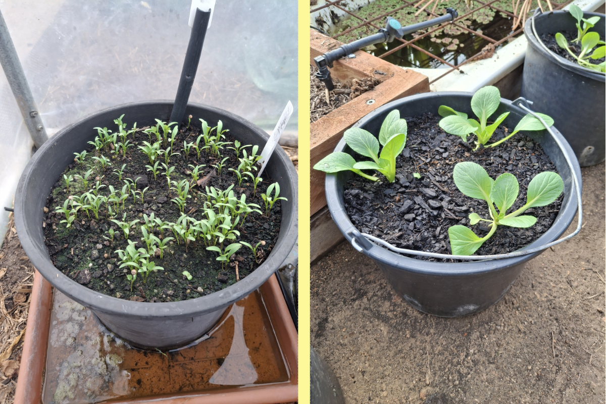 RIGHT: Pak choi seedlings in a wet pot. They have been planted closer together than the recommended distance for pak choi of 15 to 30 cm apart.