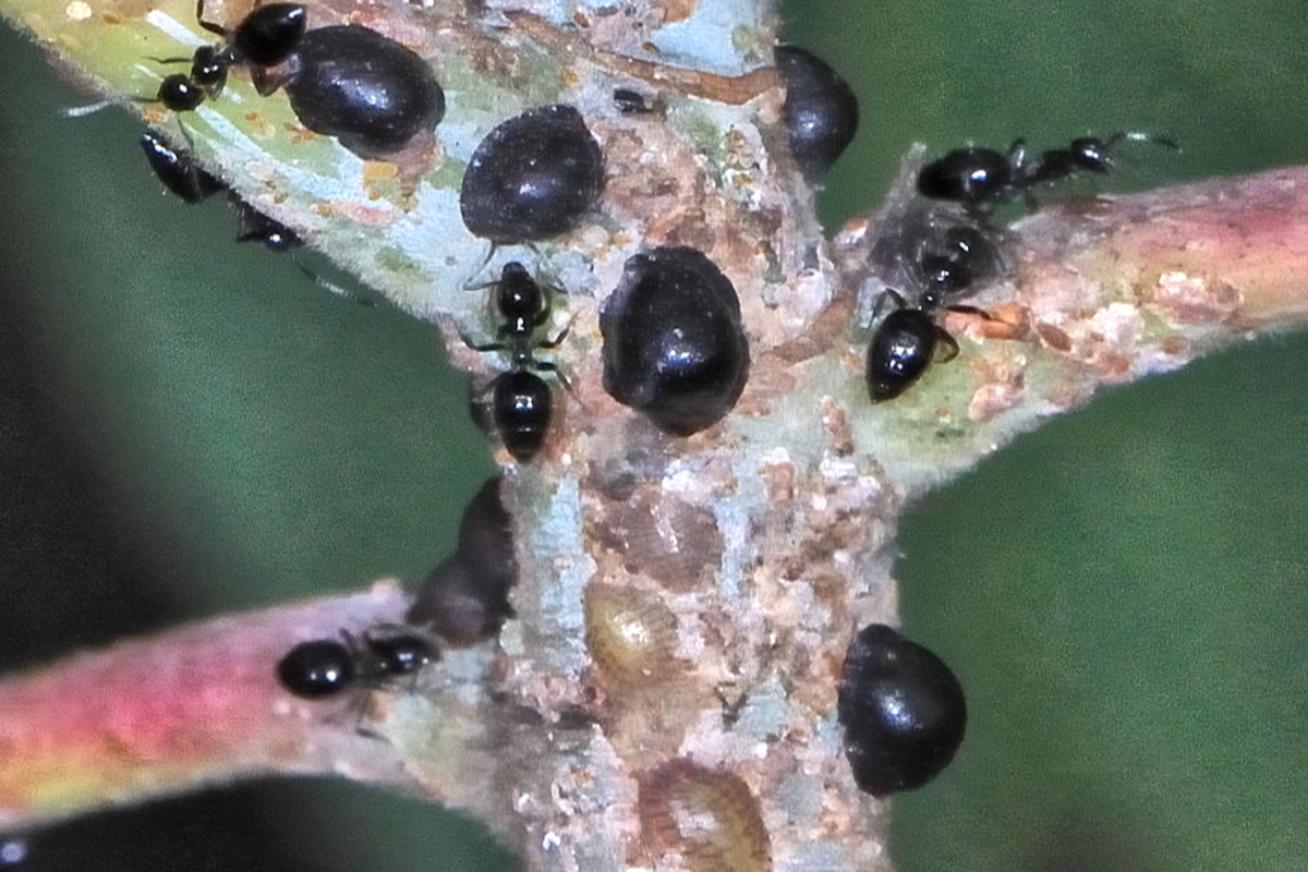 Ants act as farmers for black scale, protecting them from predators and harvesting the honeydew that the scale secrete. Photo courtesy of the internet.
