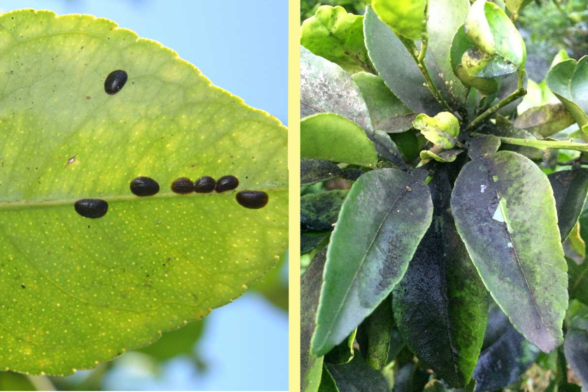 LEFT: Black scale on a citrus leaf. RIGHT: Sooty mould on citrus leaves. Sooty mould grows on the honeydew that black scale secrete. Photos courtesy of the internet.