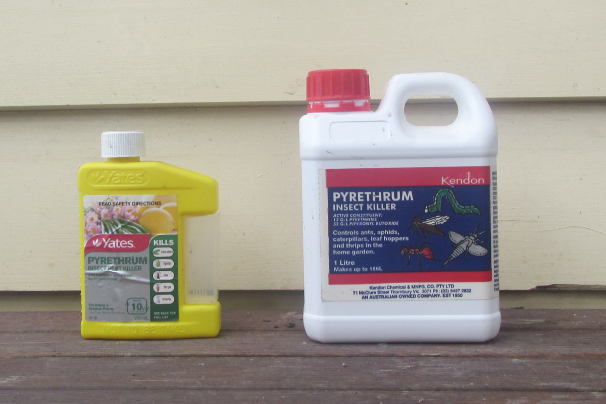 LEFT: Yates 200 ml pyrethrum concentrate. RIGHT: One litre Kendon Pyrethrum concentrate. Buying the concentrate in larger containers (as I do) is more cost effective than buying it in small containers.