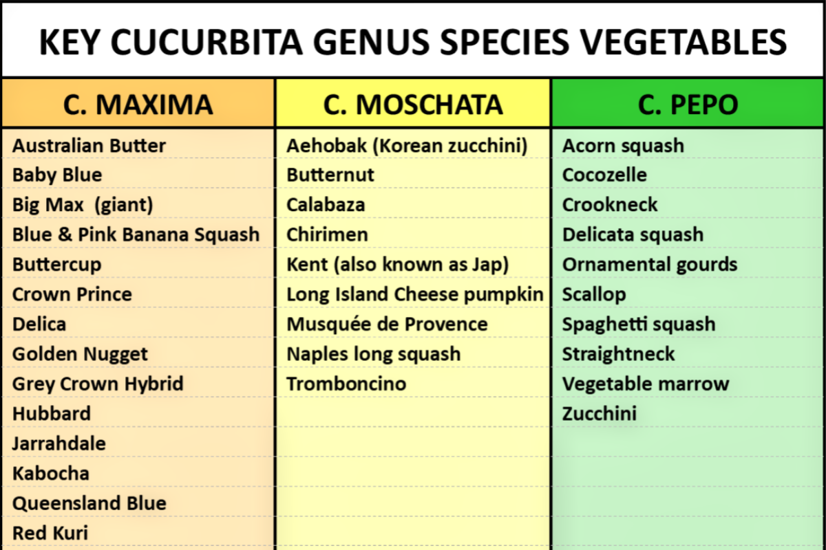 This chart helps gardeners identify which variety of squash, pumpkin or gourd is from which species within the Cucurbita genus.