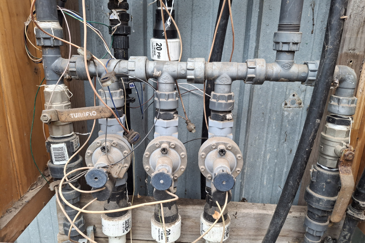 I use an irrigation controller to do most of my automatic watering. By opening and shutting just four valves I can easily switch the water supply to the controller’s solenoid valves from mains to rainwater and vice versa.