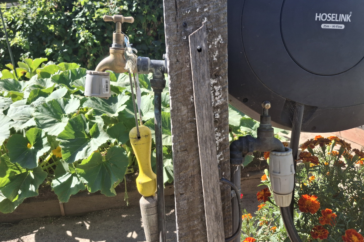 LEFT: The mains water tap in the vegetable garden. RIGHT: The rainwater tank tap that is right next to it. Having them close together means that I can easily switch my garden hose from mains to rainwater and vice versa at a moment’s notice.